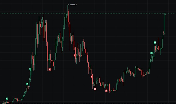 卖出点一: 64268.24 USDT(最新周期的高点,短期内可能遇到阻力)