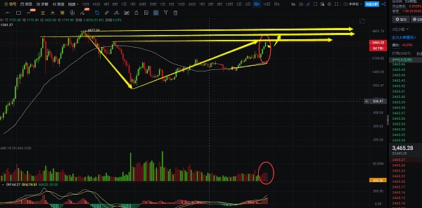 周线上看,以太的上涨虽然也是比较强的,但是相对于大饼来说还是差了点,以太反弹上方还是有几个压力位置,目前距离最近的是3580位置,这里作为前面反弹的高点,是能够给到一定的压力的,后面是4020位置,4020位置相对来说压力就会更大一点,到达该位置后突破是需要很大的力量的,以太目前周线收线情况来看,本周去试探4000附近压力的机会是比较大的,连续5连阳,上涨过程中也没有出现很大的放量,说明市场的多头头寸还是在持有中,没有出现大幅度出货,整体走势来看还是一片大好,以太交易上也是回调做多为主,做高空有利润了就及时离场;日内短线关注3350附近,到达后可以做多单的布局,自行把握好进场机会;短线交易,控制风险,盈亏自理;