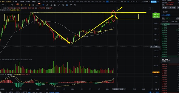 周线上看,大饼距离69000只有一步之遥了,周线收线目前到达前面上涨过程中的一段筹码密集区域,这里是有机会给到一定的压力的,交易上注意一下,目前周线收线情况,实体大阳柱,这跟阳柱还没有伴随着很高的成交量,说明市场上的多头还没有出现大幅度的平仓,目前大饼出现大跌的机会不是很大,如果按照前面走势来说,大饼本周破69000的机会是比较大的,69000一旦突破,上方将没有顶,那就不知道要去8万还是10万了,现在交易上,做回调多会更稳一点,反弹后做空不能贪多,赚了就及时离场,大级别出现强烈做空信号,我们再可以布局长一点的空单;日内短线回调点位预计在62000附近,跌破看60500附近,这两个点位均可尝试多单,自行把握进场机会;短线交易,控制风险,盈亏自理;