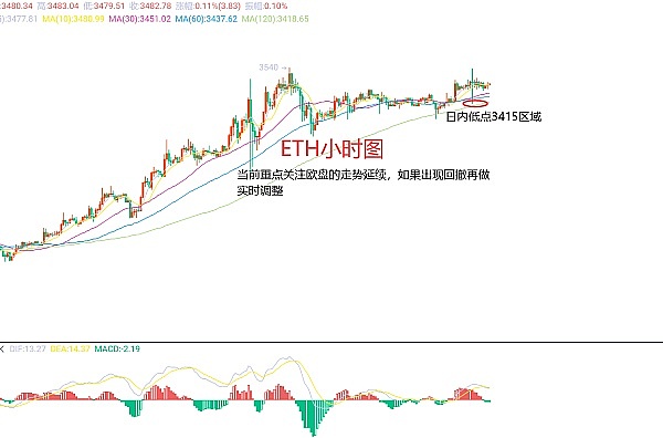 3月4日以太坊(ETH)合约技术面分析:今日方面,大周期日线级别昨日报收小阳线,K线形态上连阳上涨,价格在均线上方,附图指标金叉运行,价格回撤修正均线支撑在3430区域,而当中我们需要注意的还是我每天强调的,回车风险,和向下回撤幅度较大时要做关注是正常回撤修正还是反转,不要自己乱了节奏;短周期小时图当前K线形态连阳,附图指标死叉运行,是比较矛盾的,但时间接近欧盘,价格还是在高位盘整,再根据近期回撤没有力度的走势规律,因此今日ETH短线合约交易策略:现价3475区域直接多,止损3450区域,目标看3440-3450区域