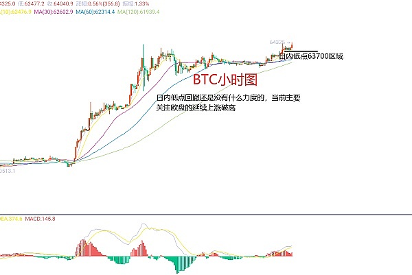 3月4日比特币(BTC)合约技术面分析:今日方面,大周期日线级别昨日报收小阳线,K线形态上连阳上涨,K线形态连阳单阴,上周价格向下出现较大的回撤修正,在回归均线之后出现二次上涨,当时跟大家讲过这是正常的修正走势,不是反转,所以大趋势上继续看延续上涨;短周期小时图当前整体走势处于震荡上行,虽说价格没有出现强势破高的走势,但K线形态连阳,附图指标金叉运行,价格在均线上方,那么日内以及欧盘延续上涨是大概率的,所以今日还是要看破高的走势;因此今日BTC短线合约交易策略:现价64050区域直接多,止损62700区域,目标看64500-64600区域;