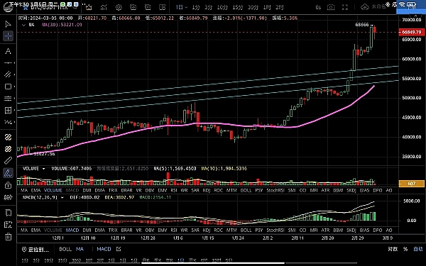 大饼昨日多次下跌至63300附近都没能跌破,随后行情一路走高,最高触及68666一线受阻回落,恭喜跟上低多思路的朋友获利五千点,目前币价在66480附近运行,四小时级别k线碎步上涨形成十连阳,随后收十字阴线打破多头上行,走出一波小瀑布,macd多头逐步缩量快线拐头向下有死叉迹象,目前价格已来到历史前高附近,预计一次突破的概率不大,有形成顶背离结构的可能,短期切勿追涨等待二次反弹不破前高可以尝试做空,日线级别macd多头逐步放量双线金叉向上,价格一路走高,若能站稳64000本周则有很大概率突破历史高点,低多筹码继续持有,思路建议回踩低多为主高空为辅,上方压制68200-69000,下方支撑64000-63000