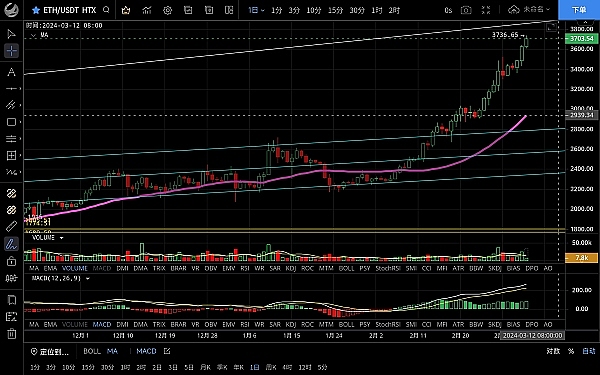 以太坊走势与大饼一致,整体一路走高,最高触及3736一线受阻,恭喜跟上近期低多思路的朋友获利近三百点,目前币价在3695附近运行,四小时级别行情一路连阳上行,ma均线向上发散,多头逐步放量双线金叉向上运行,整体走势来看多头趋势强烈,虽短期滞涨但回踩力度不会太大,还有上攻突破的可能,日线级别来看看涨趋势没有改变,虽没有大饼那么强势,但整体也在走高突破,预计后市会受消息面影响变得强势,思路依旧是低多为主高空为辅,上方压制3770-3900,下方支撑3600-3460
