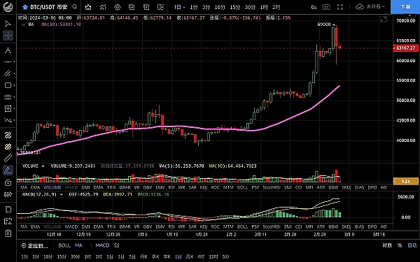 大饼昨日晚间再次冲高至68940附近承压迅速回落,低位跌至59133一线支撑,文中提示反弹后尝试做空思路完美验证,恭喜跟上的朋友大赚八千点,目前币价在63200附近运行,四小时级别行情冲高回落,上方阻力明显历史高点不会那么轻易突破,文中也是给了提示的,短期形成顶背离结构行情回落近万点打破上涨走势,macd空头逐步放量双线死叉向下,下方受ma60支撑反弹,再次拉回6w上方,可见多头力度依然挺强,但短期再次冲高的概率不大,预计会走一波震荡修复,日线级别来看行情迅速反弹收下影线,若能守住6w4后市修复完成后会再次冲击高点,所以长线思路不变低多为主,日内建议高空低多对待,上方压制64000-66000,下方支撑61500-60000