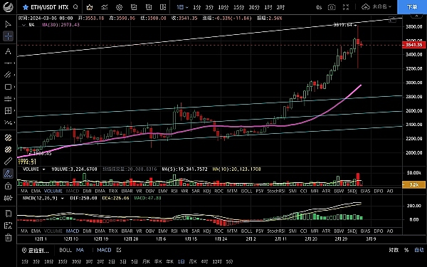 以太坊昨日白盘一路上行,晚间冲高至3820附近后迅速回落直接下跌六百点,最低至3206一线支撑反弹,恭喜跟上昨日思路的朋友,目前币价在3540附近运行,四小时级别一根大阴线打破近几日碎步上涨走势,下方受ma90均线支撑空头未能延续,价格再次拉回3500上方,macd空头运行双线死叉向下,短期直接反弹的概率不大,有二次下探的可能,不破前低会震荡后再次拉升,白盘预计会有一波调整行情,日线级别行情向下插针受阻正常调整,毕竟拉了那么多还没有回调,但这不代表牛市结束,插针是为了洗场内合约为了后市拉升做铺垫,牛市依然还在,看涨思路不变,依旧是低多为主,短线的话高空低多对待,上方压制3650-3730,下方支撑3400-3260