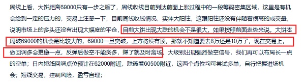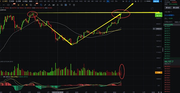 周线级别上看,大饼破了前面高点,拉升后并未出现很大的成交量,说明市场还没有很大的出货的动作,日线级别上是有一定的成交量,就算回调也不会走出很大回调,后续再多几次出现高额成交量那就有出货的嫌疑,目前大饼周线上看,还要继续去走反弹,这个69350位置不会是顶,交易上我们保持回调做多的思路就可以了,前面跟大家说了,破历史高点上方将没有压力,历史高点突破后价格将会往10万去靠,还需要给行情一点时间,后续还有减半,以及降息等等利好,都是属于长期的利好,今年大饼到10万是一点问题没有;日内短线交易上,任何回调都是做多机会,65000附近可直接去布局,看69000以及更高,自行把握进场机会;短线交易,控制风险,盈亏自理;