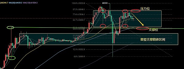 小级别两次插针震荡位置区间均是61000-63000,这个区间形成关键拐点区间,不失守就是多头的天下,实收就会延续空头,进一步的回踩下探,目前的高位整理也是形成一个区间,不考虑破位插针的情况下,上方是在68100,下方是在64500,最近也是给到此压力走回踩,给到此支撑走反弹