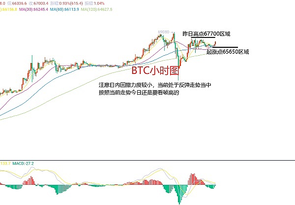 3月7日比特币(BTC)合约技术面分析:今日方面,大周期日线级别昨日报收小阳线,K线形态连阳单阴,价格在均线上方,附图指标金叉运行,在大趋势上上涨还是明显优势的,根据当前的走势规律来看,前期的回撤动作就是修正的表现,后市伴随的还是强势上涨;短周期小时图日内还是出现了小幅回撤的走势,当前K线形态连阳,附图指标有粘合金叉迹象,起涨点位置在65650区域,昨日高点在67700区域,那么今日还是继续看上涨破高的,因此今日BTC短线合约交易策略:回撤66200区域多,止损65650区域,目标看67500-67800区域;