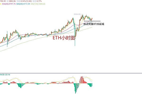 3月7日以太坊(ETH)合约技术面分析:今日方面,大周期日线级别昨日报收中阳线,K线形态连阳单阴,价格在均线上方,附图指标金叉运行,前期出现的较大回撤,价格虽说向下刺破了低点支撑位置,这个也跟大家讲过,幅度看起来较大,单价格确没有动,所以这也就是修正的表现,趋势还是上涨明显;短周期小时图日内小幅回撤修正,低点支撑位置3735区域,昨日高点位置3904区域,当前K线形态连阳,附图指标死叉运行,但回撤是没有力度的,今日还是要看延续上涨破高的,因此今日ETH短线合约交易策略:回撤3765区域多,止损3734区域,目标看3860-3880区域