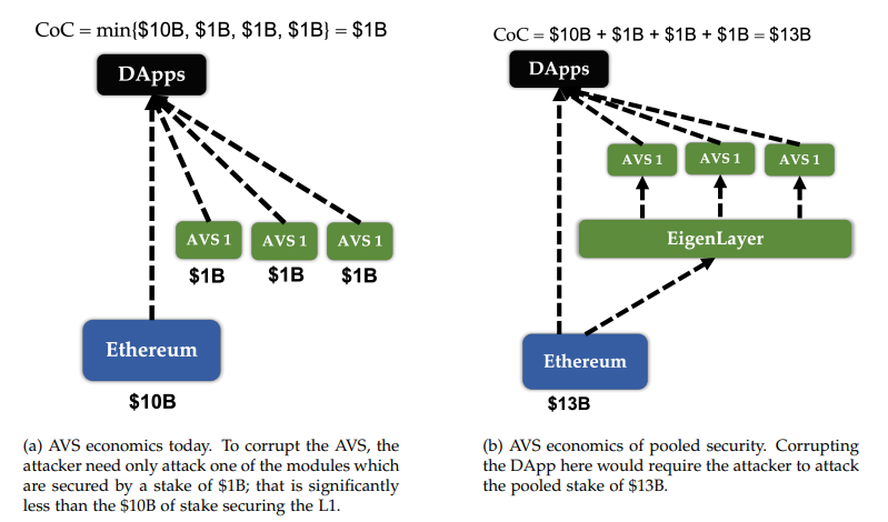 EigenLayer 的核心功能是使以太坊的安全性多样化,在下图示例(来自白皮书)中,三个 AVS 借助再质押协议更容易的获得了更大资金量带来的共识安全性,同时也没有造成 ETH Layer1 的削弱: