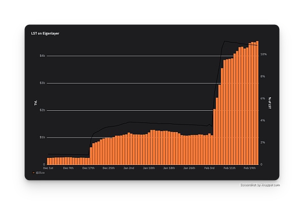 EigenLayer 是以太坊上的一个创新协议,它引入了 Restaking 机制,允许在共识层重新使用以太坊和流动质押代币(LST)。截止 2024.02,EigenLayer 协议上的锁仓价值已经达到了 45 亿美元,其中 LST 占比 40% 左右;同时著名投资机构 a16z 也刚刚宣布了 1 亿美元的投资,其生态项目 Renzo、Puffer 等都先后拿到了 Binance、OKX 等投资。这些也标志着它在完善以太坊定标基础设施和提高加密经济安全性方面取得了重大进展。