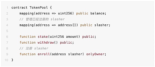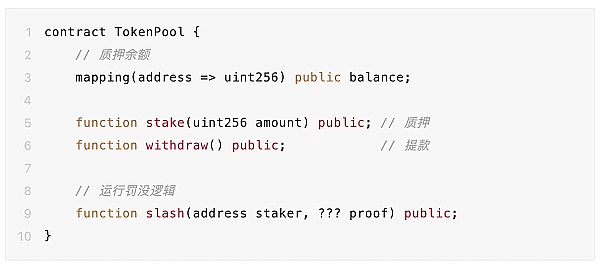 首先,我们以流动性质押代币的再质押举例,最简单的 TokenPool 实现只需要满足三个功能:质押、提款、罚没,通过 Solidity 实现出来的效果如下: