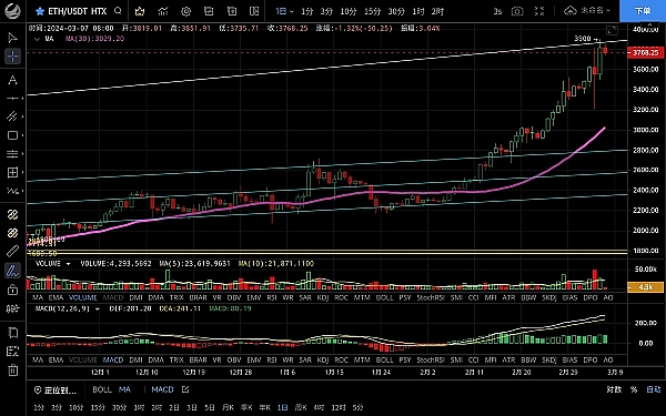 以太坊昨日回踩洗盘后再次拉伸,突破新高至3900一线受阻回落,低位跌至3724一线支撑,恭喜跟上昨日思路的朋友,目前币价在3764附近运行,四小时级别高点逐步降低,k线连阴回落,macd多头逐步缩量双线拐头向下有死叉迹象,行情冲破前高后未能延续,短期走势偏向回踩,下方关注3680支撑情况,日线级别k线收长十字星,形成双顶回落,日内突破的概率不大,将走出一波回踩修复,预计空间不会太大,回踩确认支撑后会继续上行突破,思路建议低多为主高空为辅,上方压制3820-3880,下方支撑3730-3600