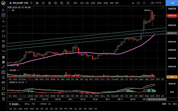 大饼昨日走出v型反弹,最高触及67610附近受阻回落,低位跌至64640一线支撑,恭喜跟上昨日思路的朋友,目前币价在66122附近运行,四小时级别行情反弹未破前高再次回落,macd空头运行双线死叉向下,短期走势还有回落需求,下方关注ma30均线支撑,不破可以进多,日线级别多头逐步缩量短期冲高的概率不大,预计行情将陷入震荡盘整,盘整结束后会再次上攻,短期关注60000-68000区间,不破可以高空低多操作,上方压制66700-67600,下方支撑64500-63000