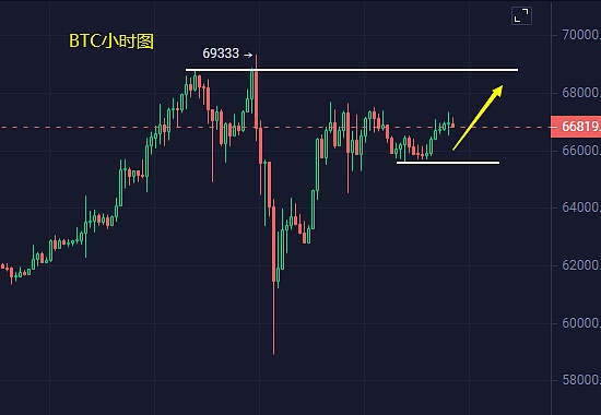 上涨阶段的回调是正常现象,毕竟这轮强势的上涨中几乎没有出现像样的回调来释放上涨势能,尤其自以二月底51000附近作为第二阶段的起涨点以来,多头几乎是一路高歌,再结合每次新高必大跌的走势规律来看,也不用惊讶,更不要盲目的去抄顶,日线来看,虽然大阴K吞没前阳,但阴K不连续,同时在探底回升之后日线又转阳反弹,所以从日线形态上看并没有出现顶部反转的结构,目前上方主要关注68500一线的阻力压制,如果此次反抽能够再度反弹企稳此位置的话,日线后续还是看涨;短线来看,小时线走了一波V反,但没破高,不过好在收复了大部分跌幅,并且在今日没有回吐,小时线目前短线阻力集中67500一线,此位置是昨日反弹的压制,如果晚间币价能够突破此位置,短线将继续上看68000-68500,晚间操作还是低多为主。