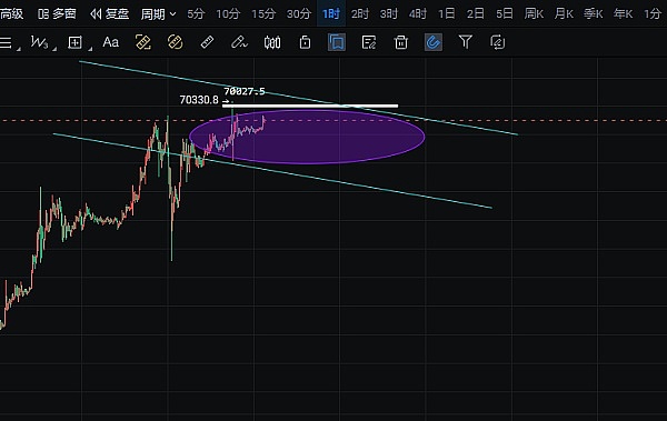 大饼。破高7万之后形成短期放缓,币价反复在67000到69000附近窄幅震荡,而以太短期联动仅摸高4千附近,可见空间上其他山寨币筹码有所抽离。目前小时图来看,boll通道持续给到收窄信号,多次企稳中轨动能乏力,附图也形成欠缺超买,空间上回踩动机明显,今日操作上,李隆建议围绕7万高点压制,伴随以太去中线空一次,进场切记做好分批风控计划。
