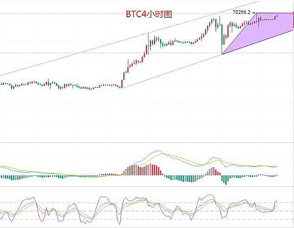 再来看一下短线四小时趋势可以看到,K先承压7万关口附近,五日均线向上比较平稳,MACD缩量即将结束,DIF和DEA开始形成金叉短线多头比较强势,主力有放量拉伸的可能,KDJ向上开口以后,主力开始测试布林带UB压力位69600,下方支撑关注67800和66000两个位置,