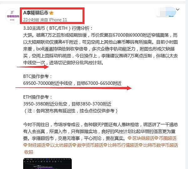 大饼。如李隆昨日午间所说,7万压制给我空,早间顺势插针失守67000附近,盘中目标再次成功扫盈,看空思路走出3000点的把握空间,实力番苍,全网见证!点位依旧精准吻合,盘中理性稳健取舍。李隆聊后市,交易无难事,平心而论,贵在真实。
