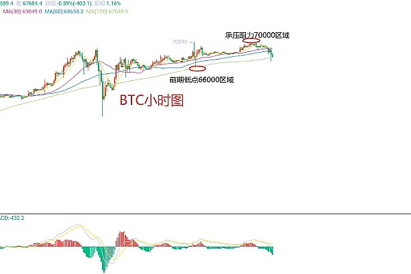 3月11日比特币(BTC)合约技术面分析:今日方面,大周期日线级别昨日报收小阴线,K线形态上出现连阴形态,价格虽说还是在高位,但当前承压于高点70000区域明显,且回撤的幅度较大,前面跟大家讲过,前期的下跌是修正,因为下跌幅度看起来大,实际快速反弹抹平跌幅,但当前不同,凌晨下跌早间延续且没有出现反弹走势,这是比较明显的,短周期小时图早间开跌口位置69000区域,前期回撤低点位置66000区域,这是本周需要关注的区间点位,当前K线形态连阴,附图指标死叉运行,日内要等反抽再空了,因此今日BTC短线合约交易策略:反抽68200区域空,止损68550区域,目标看67400-67000区域;