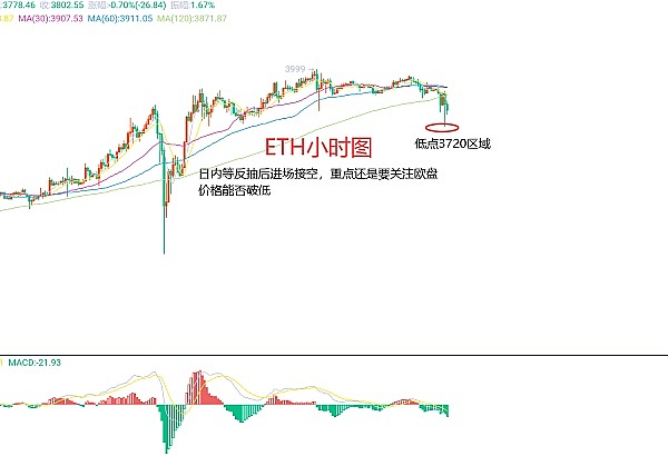 3月11日以太坊(ETH)合约技术面分析:今日方面,大周期日线级别昨日报收小阴线,K线形态连阴下跌,价格在承压于高点4000区域后首次出现回撤破位均线且价格连续破低,附图指标金叉缩量运行,快慢线高位向下拐头有粘合死叉迹象,那么后市大概率还是要走回撤下跌的走势,这一点大家注意关注;短周期小时图凌晨价格承压回撤,今日早间延续,当前K线形态连阴,价格在均线下方,附图指标死叉运行,日内下跌还是大概率的且欧盘我们要看破低的,因此今日ETH短线合约交易策略:反抽3815区域空,止损3840区域,目标看3740-3720区域