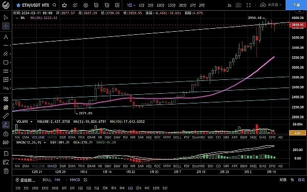 以太坊走势与大饼一致,昨日二次上攻未破前高,最高触及3963一线受阻,随后行情震荡回落,低位跌至3730一线支撑,恭喜跟上思路的朋友空单获利二百点,目前币价在3854附近运行,四小时级别行情窄幅震荡后选择下行试探箱体支撑,随后迅速收回,macd空头逐步放量双线死叉向下,ma7和14日均线粘合向下,短期指标虽偏向回落但下方支撑较强预计延续的概率不大,四小时有收长下影的可能,若能守住3800则会继续震荡,日线级别行情高位震荡后开启回落,高点逐步降低,多头逐步缩量,4k大关不是那么容易就突破的,短期走势震荡的概率较大,等待空头消耗完会再次蓄力上攻,大方向依旧是多头主导,思路建议逢低做多为主,上方压制3900-3950,下方支撑3800-3700