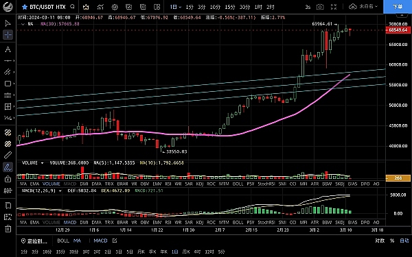大饼昨日呈震荡上行走势,最高触及69868一线受阻回落,随后行情开始下行,低位跌至67080附近止跌反弹,恭喜跟上思路的朋友空单获利两千点,目前币价在68540附近运行,四小时级别行情二次上攻未破前高走出回踩,下跌延续性不强,价格再次拉回,可见ma30支撑较强整体仍旧是多头走势,macd无量运行双线粘合,短期走势偏向震荡区间在7w-6w6,日线级别底部逐渐抬高,若跌破ma7则短期滞涨陷入横盘蓄势,若给到低位筹码可分批入场,后市仍看好向上突破,上方压制69300-70000,下方支撑67500-66600