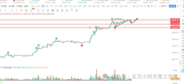 BTC行情和我们前两天所说基本一致,在69900和65600美元附近震荡行情,今天是周一我们上方还是关乎69900美元的阻力位置,看一下在接近这一位置的的反应,我们才好判断它的下一步走势