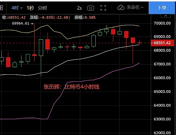 比特币1小时布林带早间触底后形成一波小反弹,现来到中轨下方,布林带整体下行趋势明显,后续可关注上轨69500-69700位置不破可高空!4小时可关注布林带下轨支持67000-66500位置,不破可多!