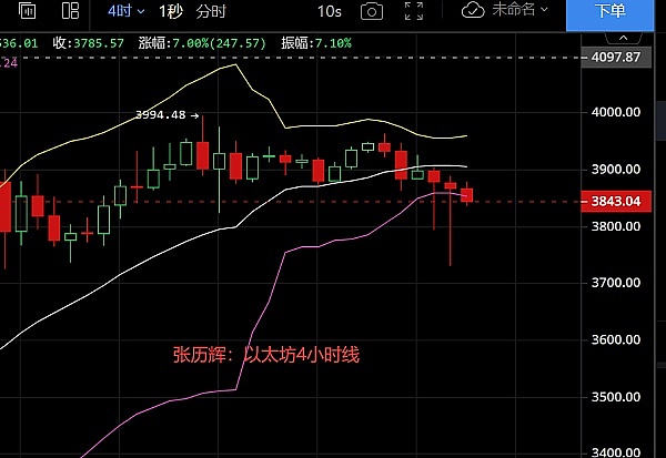 以太坊1小时布林带下方状态同比特币相差不大,也是中轨压制状态,建议关注3870-3890位置不破再考虑短空!4小时下方突破趋势明显,可关注3785-3765间不破可多!