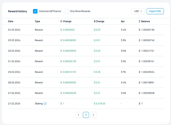 我们可以看到 stETH 的收益每天都会自动更新,下图是我们测试的收益情况,对应每天都可以检查加密钱包验证相关内容。
