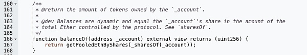 我们找到了 Lido 的合约 https://etherscan.io/token/0xae7ab96520de3a18e5e111b5eaab095312d7fe84 追溯到合约的 balanceOf 方法: