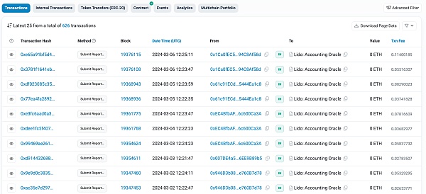 我们继续看代码, _getTotalPooledEther 中的逻辑是会受到 handleOracleReport方法影响,而这个方法则会更新合约中的相关数据。具体的调用是会通过 https://etherscan.io/address/0x852deD011285fe67063a08005c71a85690503Cee 合约定期调用 submitReportData 更新数据( submitReportData 中会调用 Lido 合约的 handleOracleReport ):