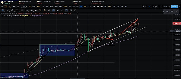 来到了7万之后大饼的每一步都是新的,因为没人见过7万以后的大饼是什么样,也没有一个历史性的点位可以参考,那么我们从K线和指标来看,现在大饼依然是走强的73000也必然不是大饼的极限。