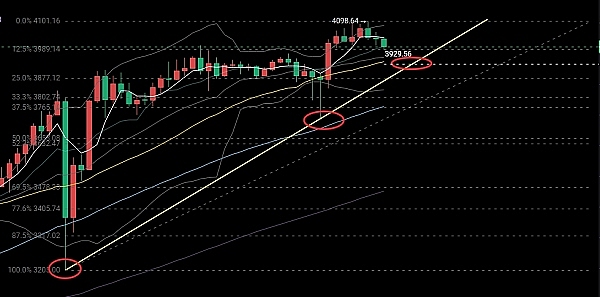 小级别,3205和3720两次的插针底部,构成了一个上升支撑线,目前支撑位给到了3930附近,行情试探上方斐波那契线压制后,日间整体就是围绕斐波那契0.12区间走的整理,下方关注0.12底部线处3990附近的支撑,五日均线有拐头向下迹象,有和十日均线粘合或者小死叉形成。技术面看日间行情会有一波回踩,下方第一支撑3390很大概率会进行试探,哦我们需要关注的是重要支撑位3930能否强支撑作用,并进行反击,所以现在行情先看回踩,不破下方支撑再考虑多单进场