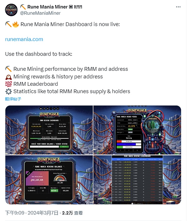 2024年3月7日 Rune Mania Miner 发文表示 Rune Mania 矿工仪表板现已上线: