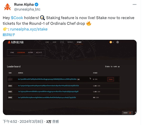 2024年3月8日 Rune Alpha 上线质押功能!在活动期间质押,可以获得 Ordinals Chef drop 第一轮的门票。