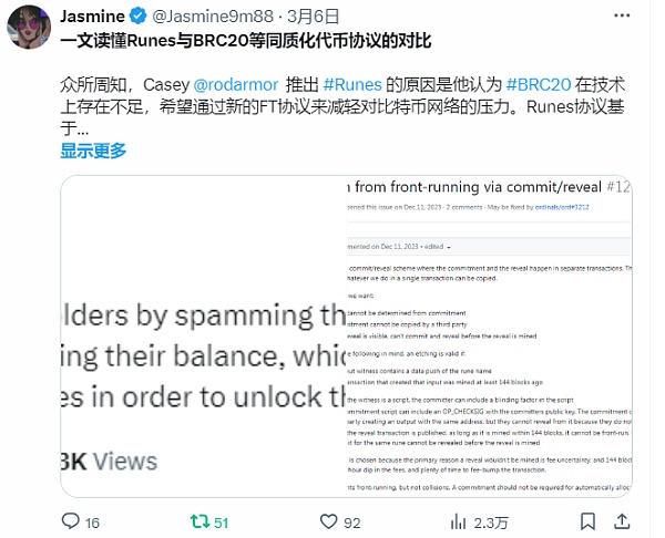 2024年3月9日 MIX 发文对 Son Pin 和 Casey 在 Github 关于「公开铭刻」机制的讨论,并增加了关于 Runes 协议发展历程,以及和 Brc20 的优劣势对比等内容。