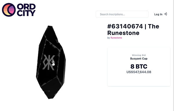 2024年3月9日,历史上最大铭文 #63140674 |The Runestone 以 8 个BTC的价格,由 Buoyant Cap 赢得拍卖,收入将用于支付 Runestone 符文的空投 gas。