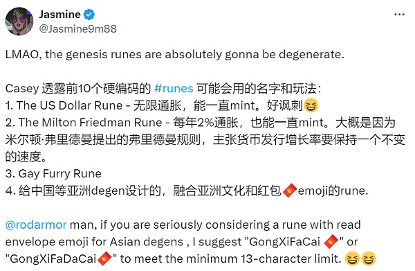 2024年3月9日 Jasmine 发文讨论 Casey 透露前 10 个硬编码的 Runes 可能会用的名字和玩法。