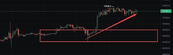 大饼目前最高已经触及72800,这个价格预期不是日线级别上涨的顶,也不是4h级别的顶,短线应该还能再往上走一小段。但是目前一笔4h级别上涨已经运行快50天了,涨幅达到了88%,所以近期有走一笔4h级别回调的需求。如果4h级别的回调顺利的走出来,那么又是一波不错的买入机会,牛市行情中,最容易捡钱的不是追高,而是一波幅度大一点的回调后捡便宜筹码。