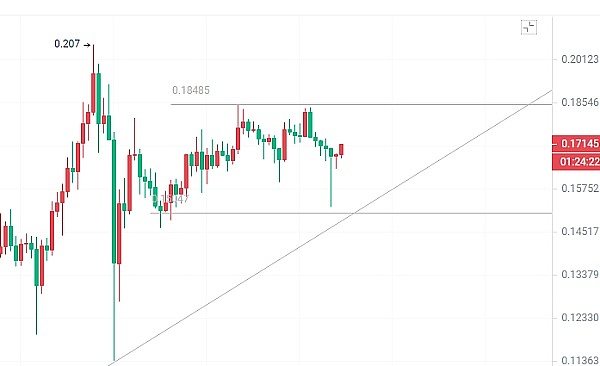 日K线昨日回踩EMA15以后开始回拉站上了均线制高点,底部进一步太高,MACD放量减少了以后DIF和DEA高位向下收口,KDJ下行交替受阻,短多趋势明显,布林带收口,短线四小时整体趋势扳回,上方关注压力位0.18-0.19区间,下方支撑依旧是0.15附近,不破的话震荡行情延续,MACD缩量上行,KDJ多有指标出现,布林带下轨站立了很久