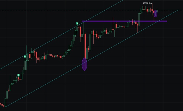 卖出点二:73000 USDT(03月12日20:00的最高价为近期内的相对高点,可作为进一步获利了结的目标)做空止损点:73000 USDT以上(超过03月12日20:00的最高价,如果继续上涨则做空策略失效)