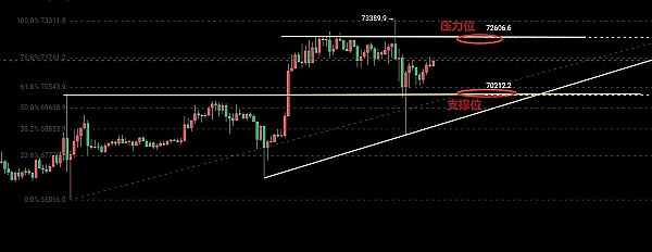 小级别,晚间的上影线和凌晨的下影线,目前的的震荡位,行情多空如昙花一现,昨天是现在的价格,今天还是现在价格,技术面五日均线死叉形成放量之后,下方受120日均线支撑,随即快速反弹,一根阳线直接站上71200,后面的就是整理阶段了,目前五日均线和十日均线金叉形成,价格站上布林带中轨,上轨平行运行,有一定承压作用。早间的小幅反弹,可以看出行情有继续向上试探压制的迹象,可以先看上方斐波那契线0.78处72400附近的压制,若能顺利的突破,那么行情将继续去试探刷新高点。下方我们需要关注的是斐波那契0.38处70300附近的支撑,同时也是关口位置,起到重要的拐点作用