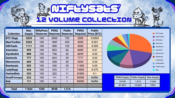 NiftySats 构建的比特币生物圈由头足类动物、节肢动物、两栖动物和爬行动物组成,总共有 11164 个手绘卡通 Ordinals,分 12 卷,从 BTC Slugs 开始按顺序铸造,第 1 卷 BTC Slug 总共 3333 个,随后每卷供应量都在减少。