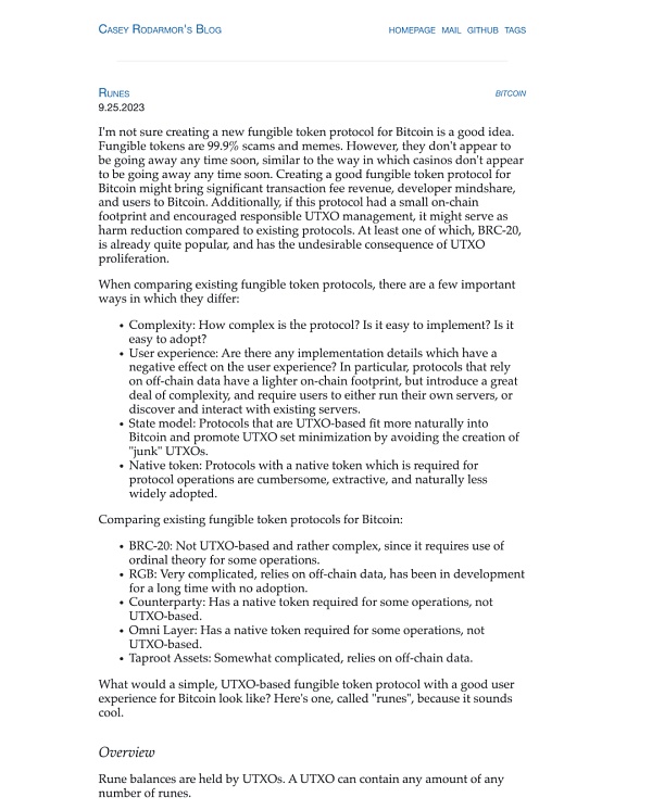 Runes Protocol 是 Ordinals Protocol 开发者 Casey 不满意 2023 年 3 月诞生的 BRC-20 代币标准使用 Ordinals 协议创造大量「粉尘」UTXO 于去年 9 月 26 日提出的基于比特币 UTXO(未花费交易输出)模型的同质化代币(Fungible Token)协议,通过简单的元组(ID, OUTPUT, AMOUNT)和 OP_RETURN 操作来管理和转移 FT。