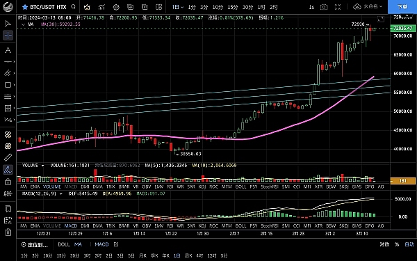 大饼昨日白盘波动不大,晚间行情冲高至73000附近受阻,随后迅速回落,最低跌至68640一线支撑反弹,恭喜跟上昨日思路的朋友多空获利共计七千点,目前币价在72050附近运行,四小时级别k线插针后反弹,macd空头运行双线死叉向下,但下方空间有限,短期关注ma7均线压制,突破才有延续上行的可能,目前走势呈高位震荡,日线级别来看有转阳k的可能,走势如思路一致,多头较为强势,上方空间无限不猜顶,按这个上涨速度10w不在话下,思路建议依旧是低多为主,上方压制73000-74000,下方支撑71000-70000