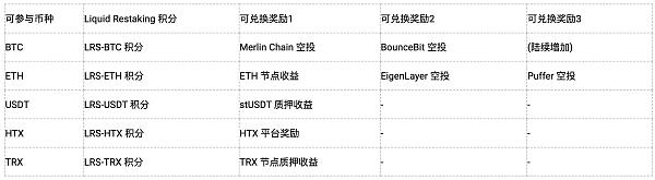 而用户在报名参与这些项目的Restaking活动后,火币HTX将根据快照结果平分当日链上奖励,并以LRS-BTC、LRS-ETH、LRS-USDT、LRS-HTX和LRS-TRX这几类形式空投积分在3日后进行发放,用户参与的时间越早且参与的现货资产越多,所获的积分就越多。这些积分可用于兑换节点收益、质押收益、项目代币空投等不同的对应奖励,将直接发放至用户的现货账户。当然,兑换的具体空投奖励将由链上项目空投实际发放为准。