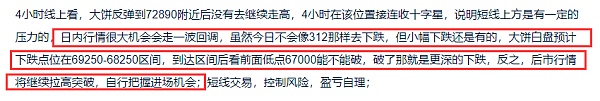 昨日是312,晚上也公布了CPI数据,现在CPI数据对行情的影响都不是很大了,市场还是多头强势,昨日我们预测行情会有下跌,也是短线下跌,行情也是如预期走出下跌,大饼下跌低点在68600,到达我们预测区间,没有去跌破67000,随后快速拉升,空单获利离场,以太也是走出下跌,下跌低点在3831位置,没有跌破3719,到达我们预测下跌目标区间后收针反弹,短线空单也是给到获利离场机会,短线下跌未破位,后市行情将再度拉高;