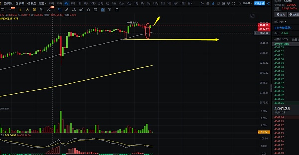 4小时线上看,白盘以太也是下跌到目标区间后收针上来,并未打破多头趋势,下跌也只是小幅下跌,白盘走势上看,以太很大机会刷新高点4098位置,预计到达点位在4250附近,距离现在价格4045还有200个点的空间,没有多单的朋友可以抓一下,白盘多头强势,还会继续拉高,自行把握好进场机会;短线交易,控制风险,盈亏自理;