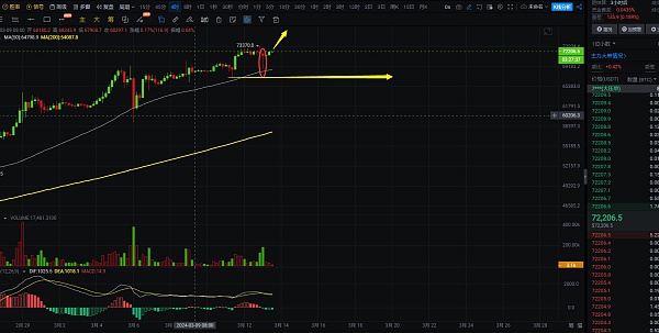 4小时线上看,大饼昨日的下跌没有跌破前面短线低点67000,随后收针,昨晚在底部开了多,因为文章有实效,就没有及时在文中通知到大家,但白盘突破73370历史高点的机会很大,现在价格去做布局都能有1000-2000个点的利润空间,后市大饼预计会往75000附近去靠,如果没有多单布局的,可以在72000附近去做布局,看74000-75000,到达后再根据走势找机会空,自行把握进场机会;短信交易,控制风险,盈亏自理;